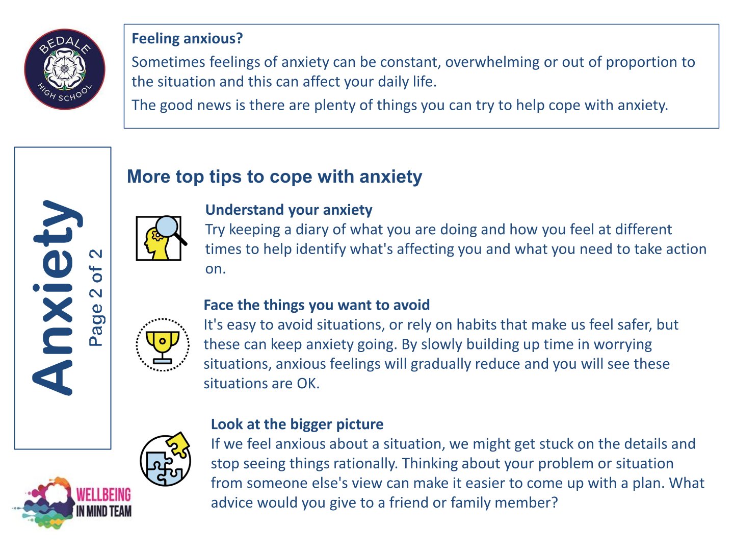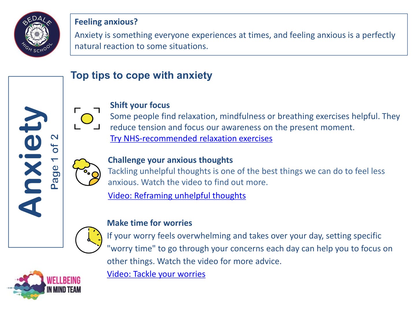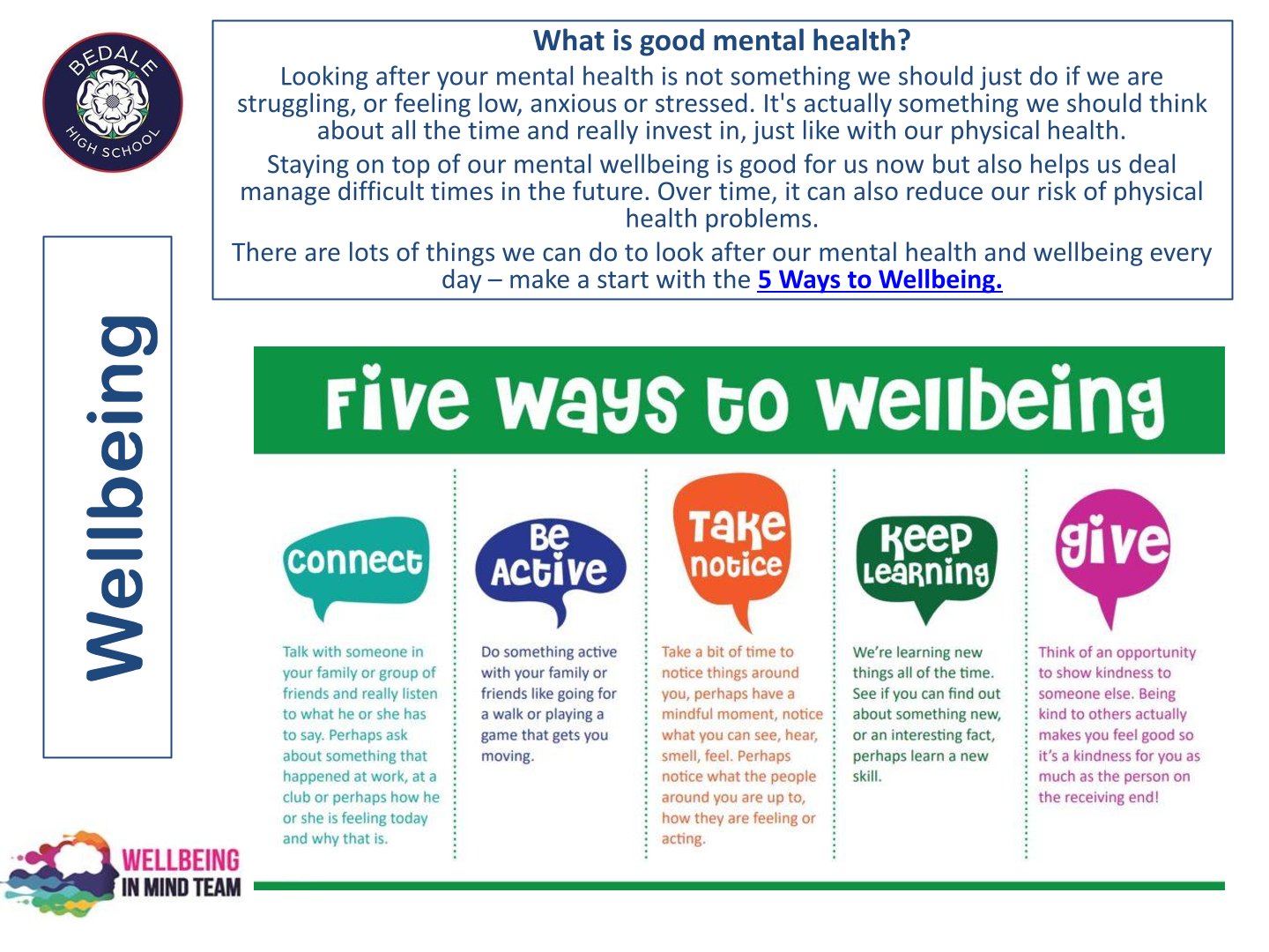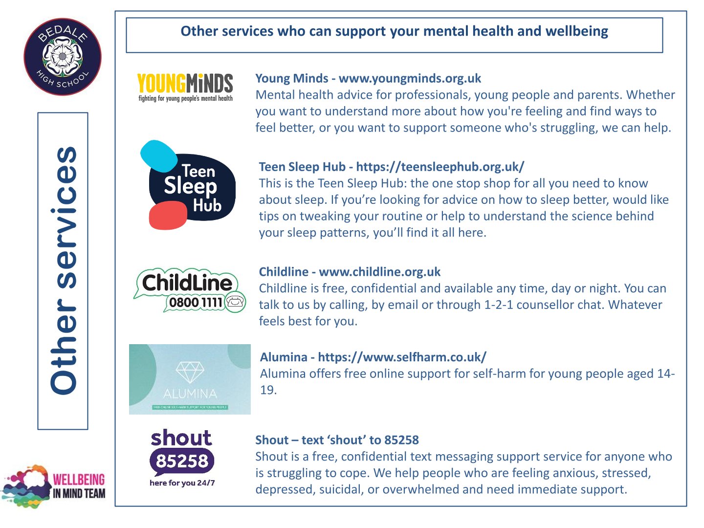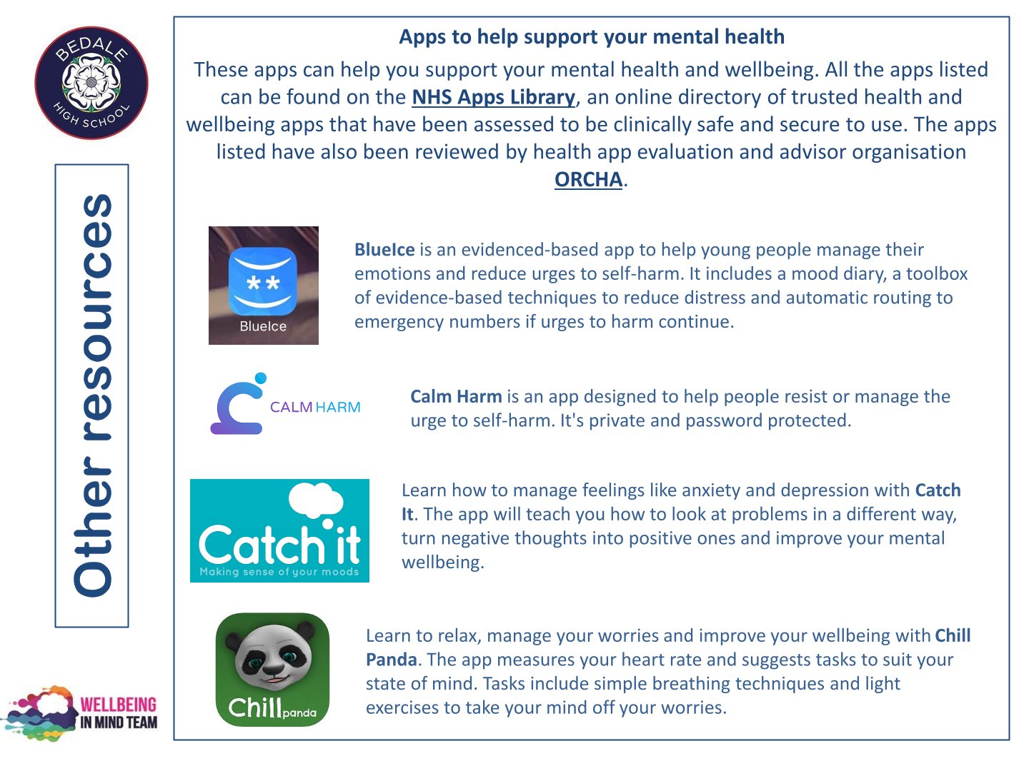 Bedale High School is delighted to work with the NHS Wellbeing in Mind team. This team of highly qualified practitioners support our young people with a variety of ways to ensure that as a school we can provide the necessary early intervention and support that is needed by our young people.