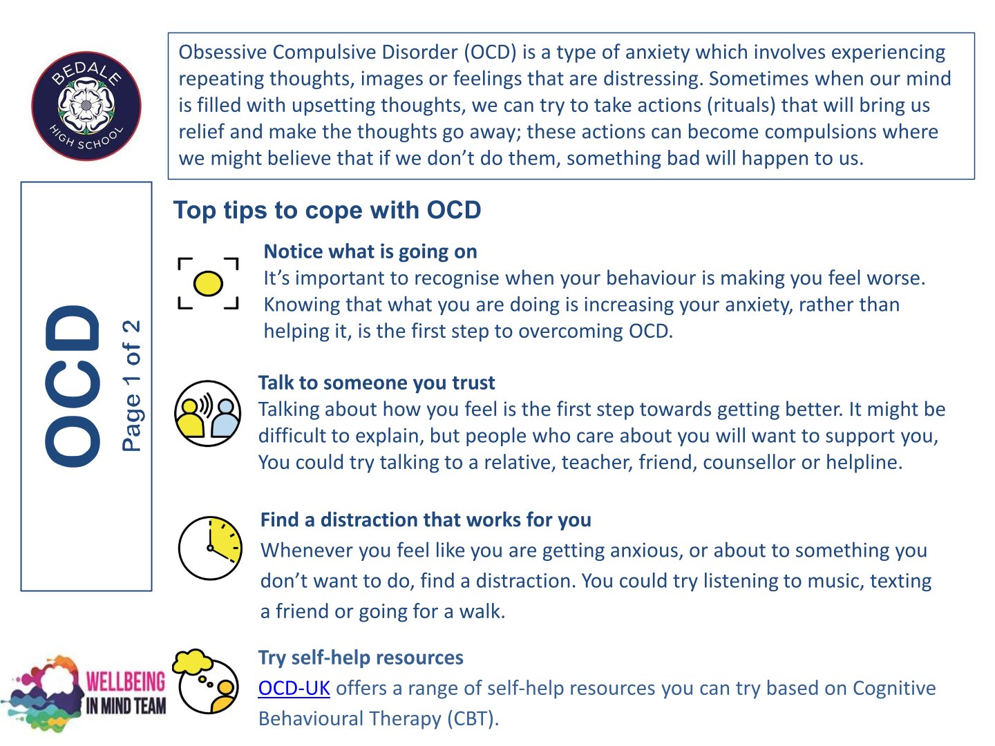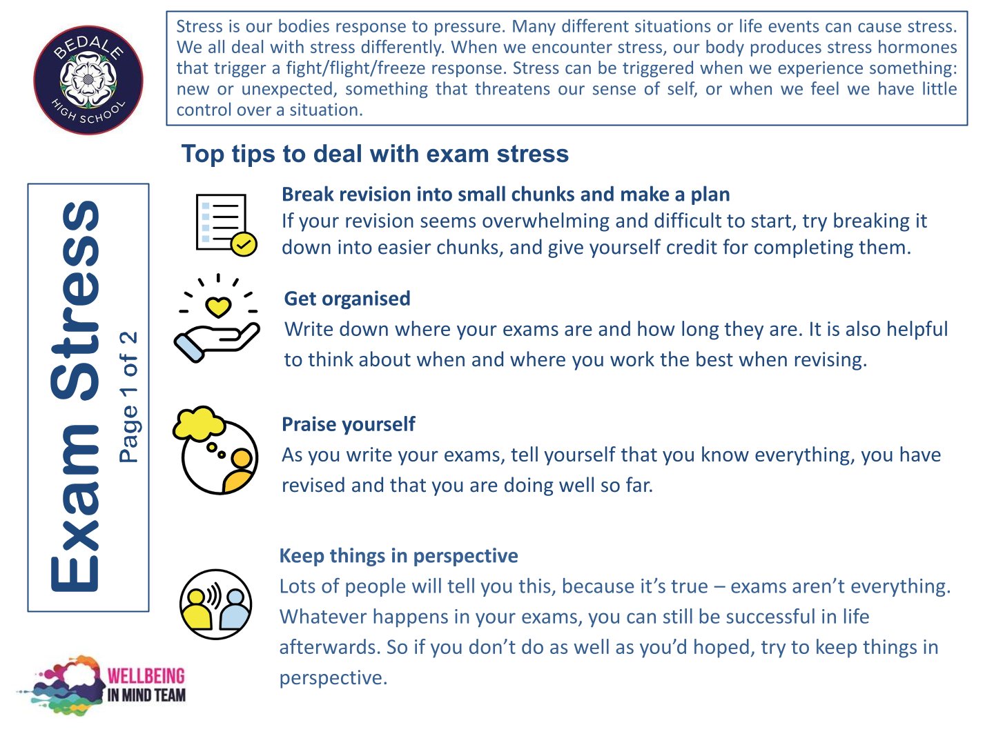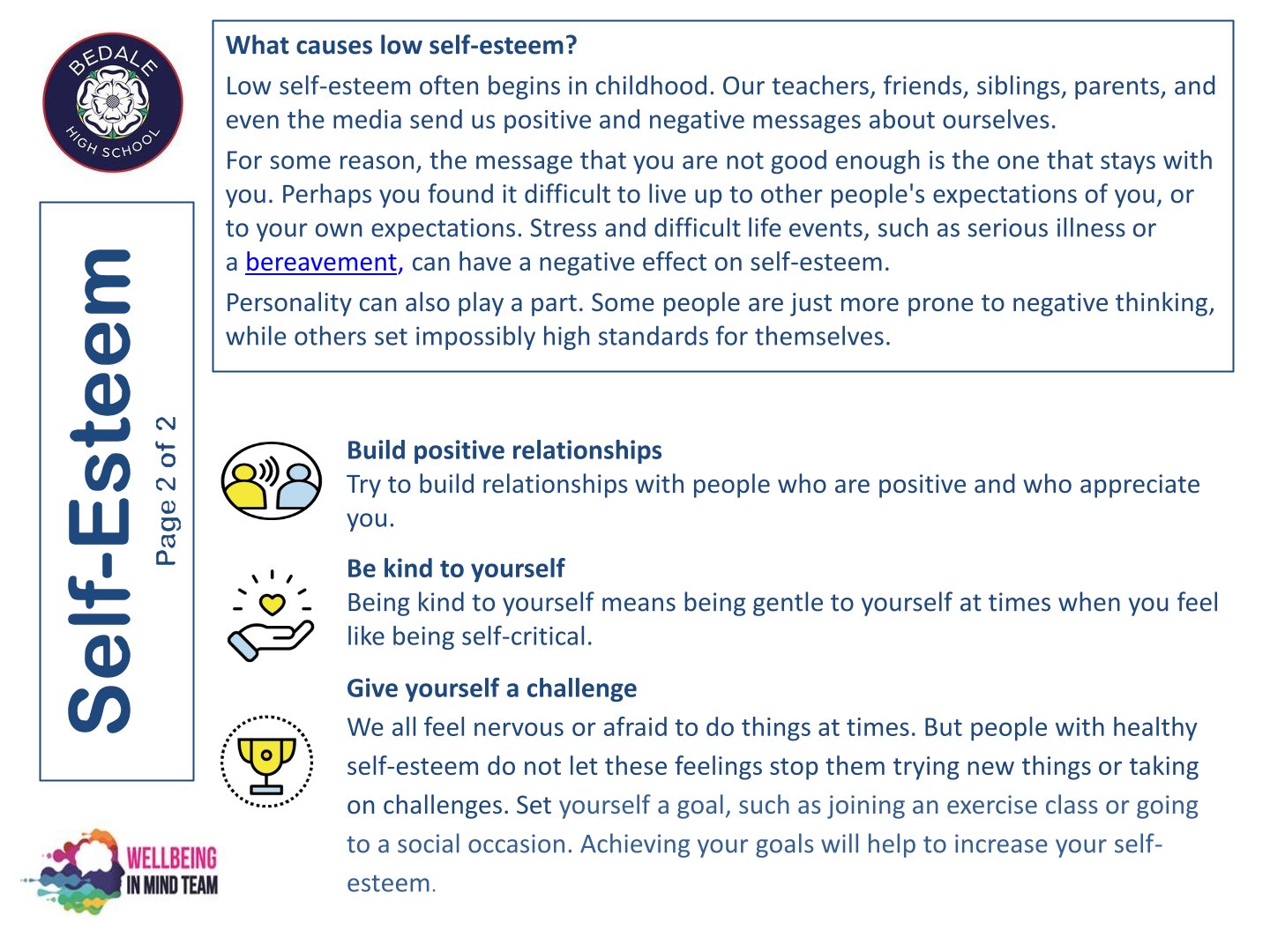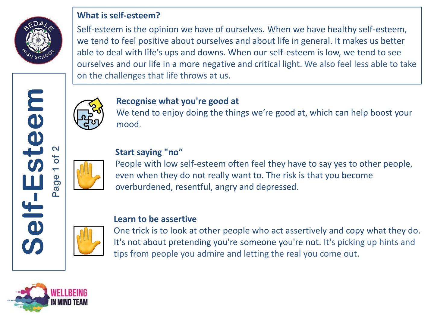 Bedale High School is delighted to work with the NHS Wellbeing in Mind team. This team of highly qualified practitioners support our young people with a variety of ways to ensure that as a school we can provide the necessary early intervention and support that is needed by our young people.