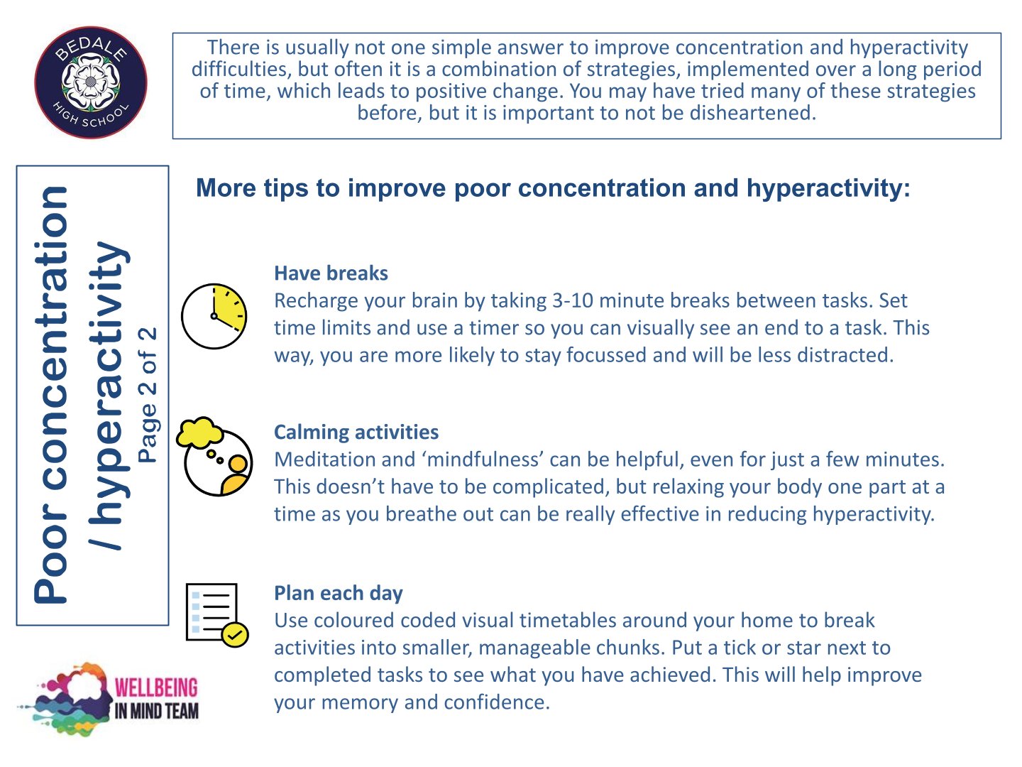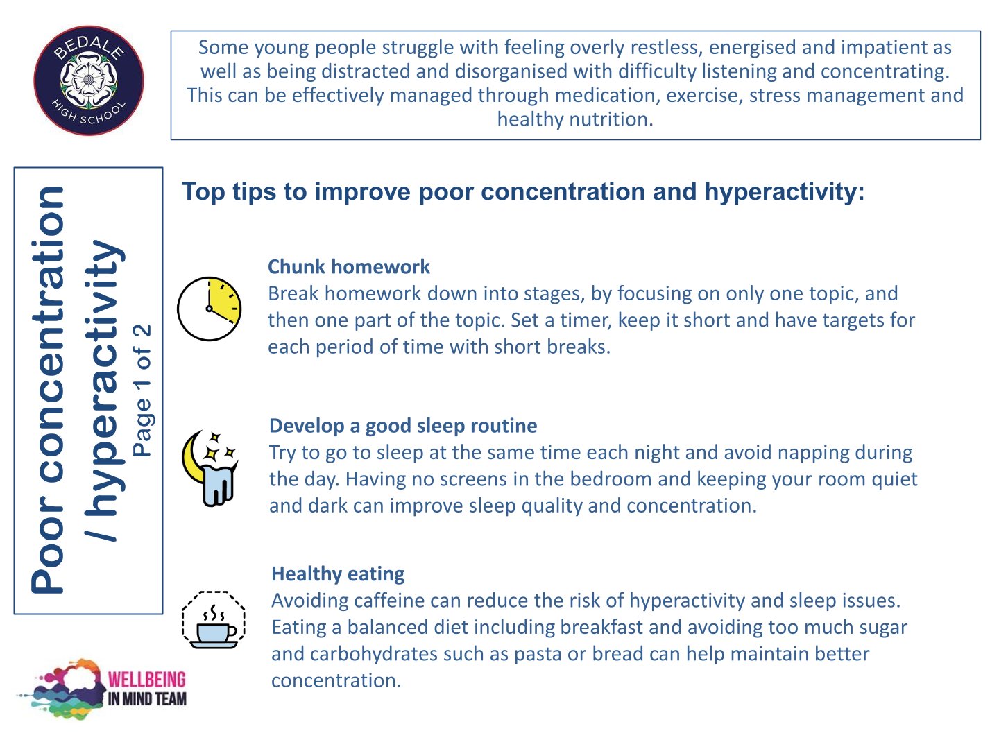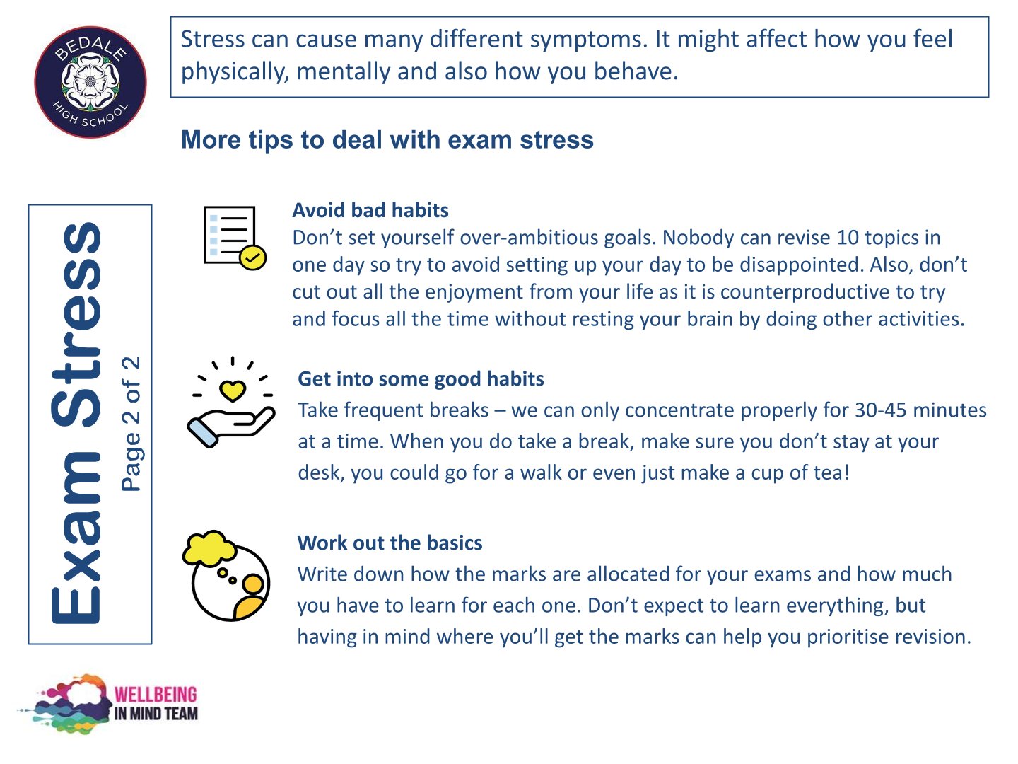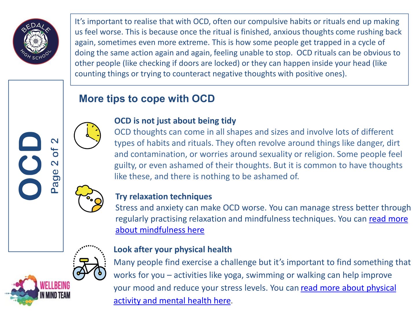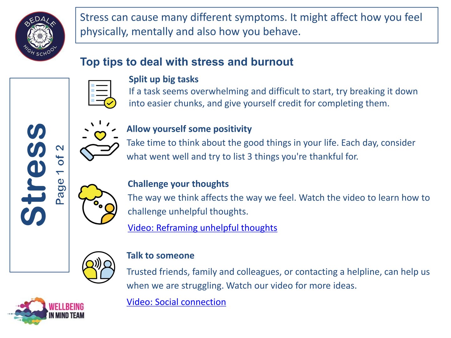 Bedale High School is delighted to work with the NHS Wellbeing in Mind team. This team of highly qualified practitioners support our young people with a variety of ways to ensure that as a school we can provide the necessary early intervention and support that is needed by our young people.